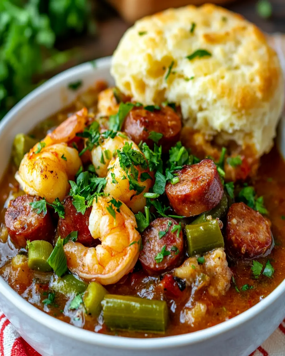 A hearty and flavorful breakfast dish that combines traditional gumbo ingredients with breakfast favorites.