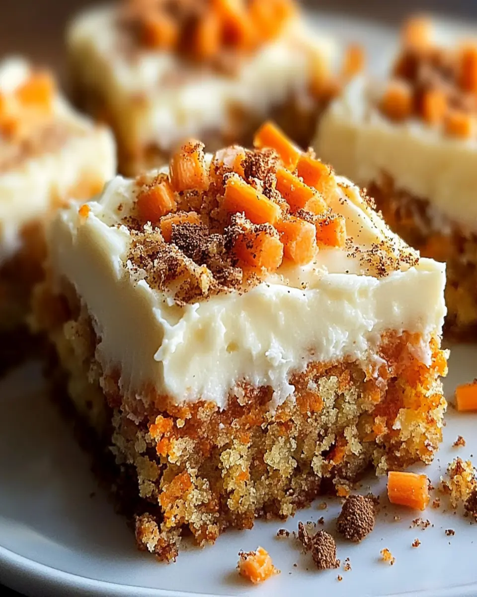 Deliciously moist carrot cake bars topped with creamy frosting, perfect for any occasion.