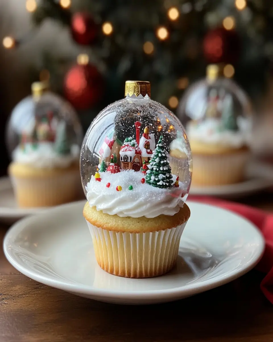 Delicious cupcakes decorated to look like enchanting snow globes, perfect for the holiday season.