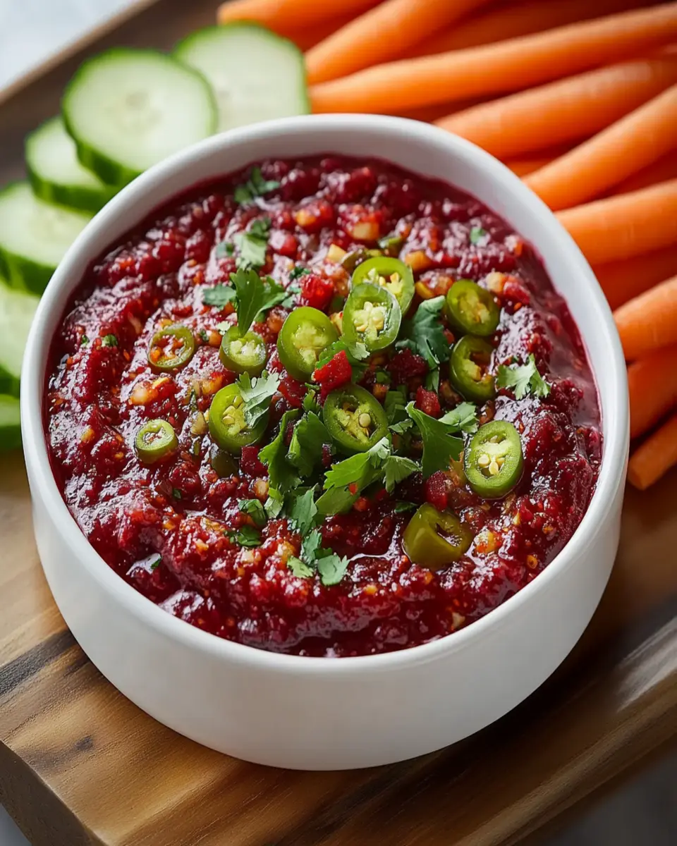 A flavorful and festive dip that combines sweet cranberries with spicy jalapeños, perfect for gatherings.