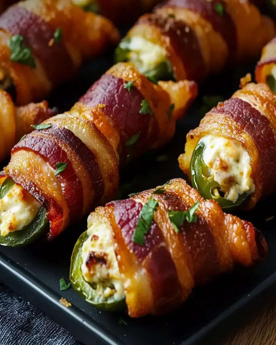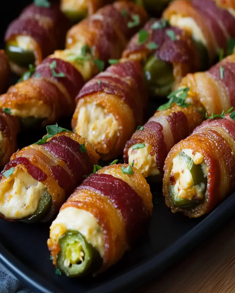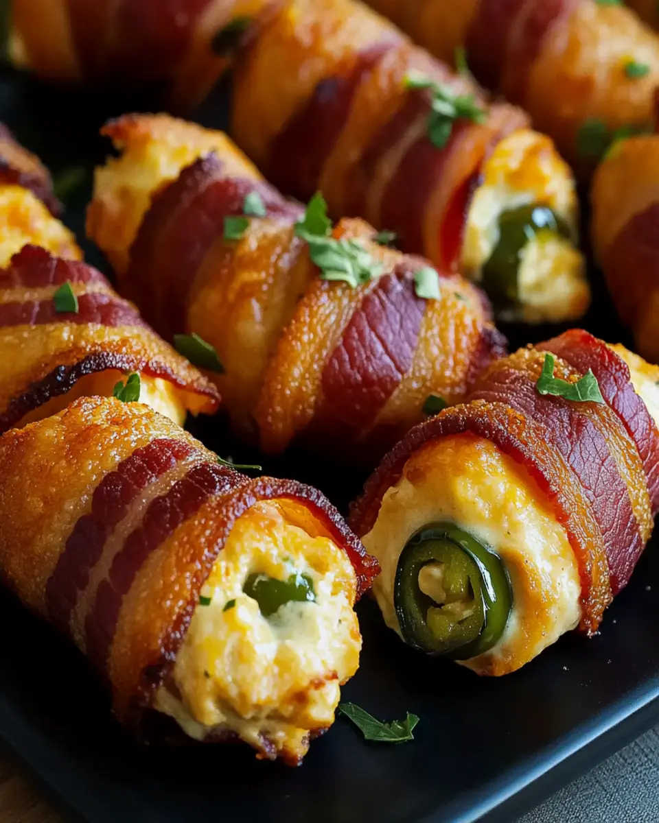 A delicious and spicy appetizer combining jalapeños, cream cheese, and savory pigs in a blanket.