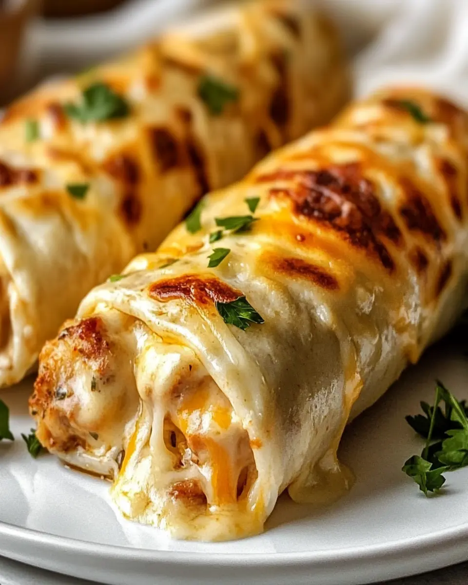 Ooey-Gooey Cheesy Garlic Chicken Wraps are delicious tortillas filled with a savory mixture of shredded chicken, cheddar cheese, cream cheese, minced garlic, and green onions. They are perfect for a quick meal that combines comfort and flavor in every bite.