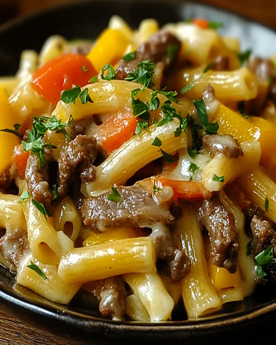 A creamy and savory pasta dish inspired by the classic Philly cheesesteak.