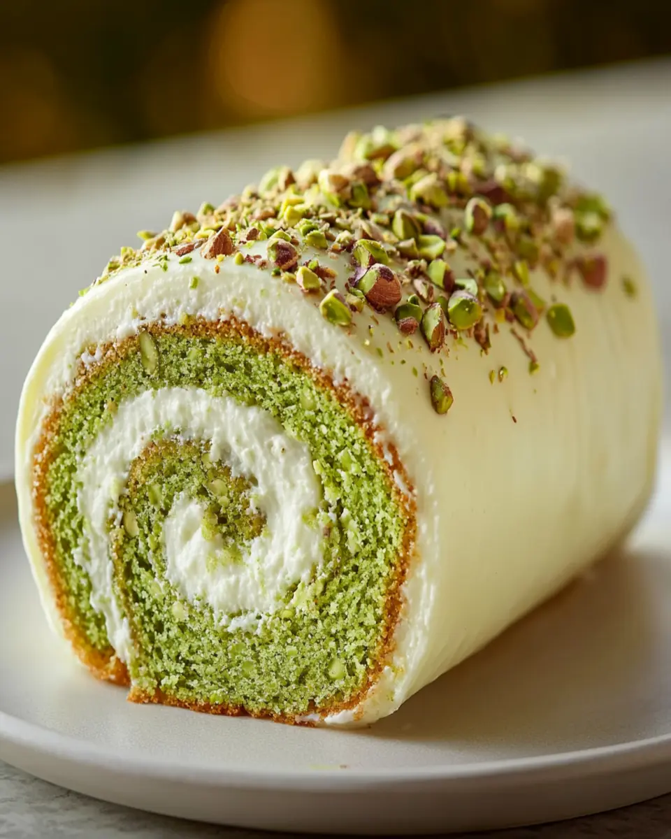 A pistachio roll cake is a light and fluffy dessert made by rolling a sponge cake filled with creamy pistachio-flavored filling. It is often topped with chopped pistachios for added texture and flavor, making it a delightful treat for any occasion.