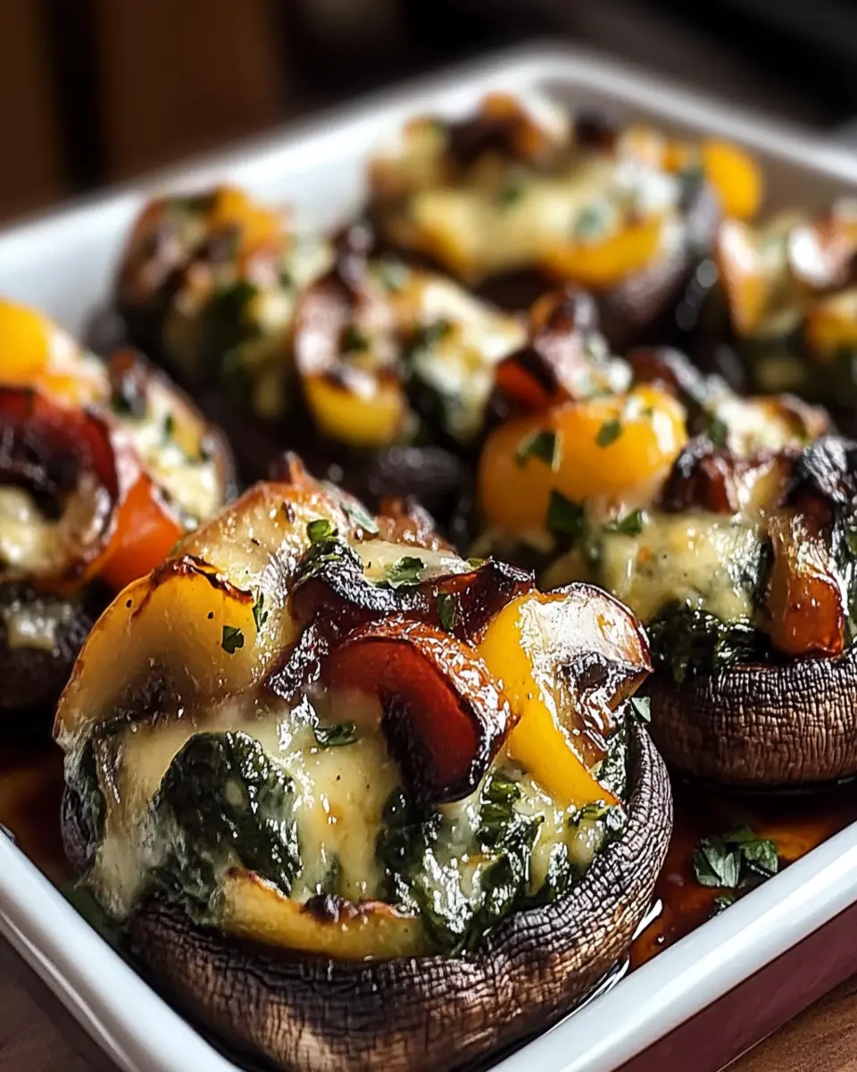 A delicious vegetarian dish featuring large portobello mushrooms stuffed with a savory spinach and cheese mixture.