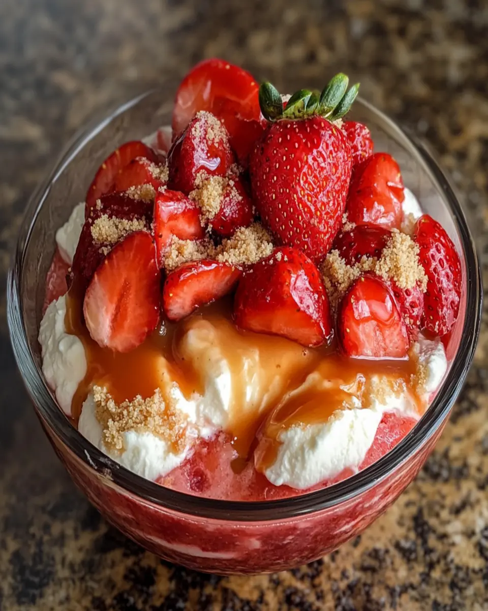 A delightful and creamy strawberry cheesecake bowl, perfect for dessert lovers.