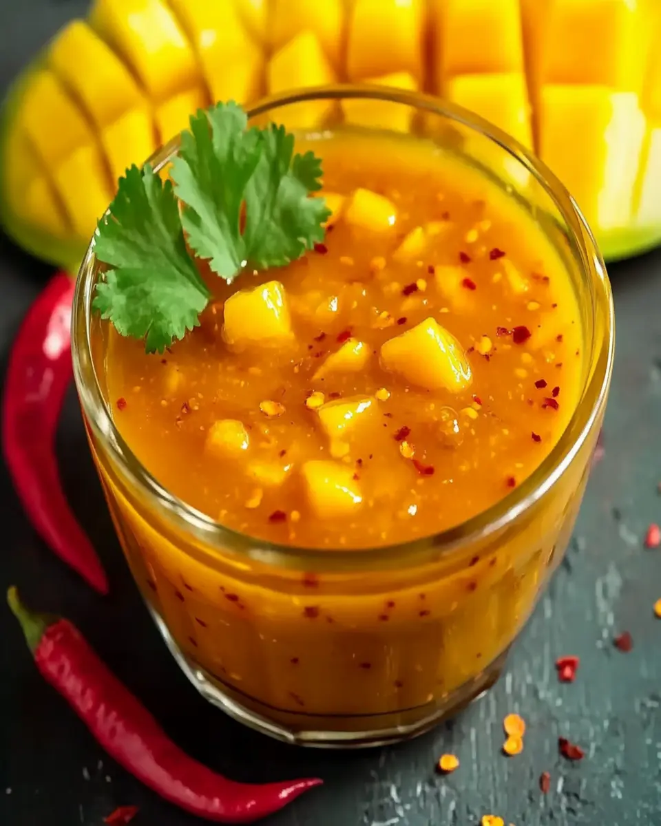 A vibrant and tangy mango sauce with a kick of spice, perfect for dipping or drizzling over dishes.