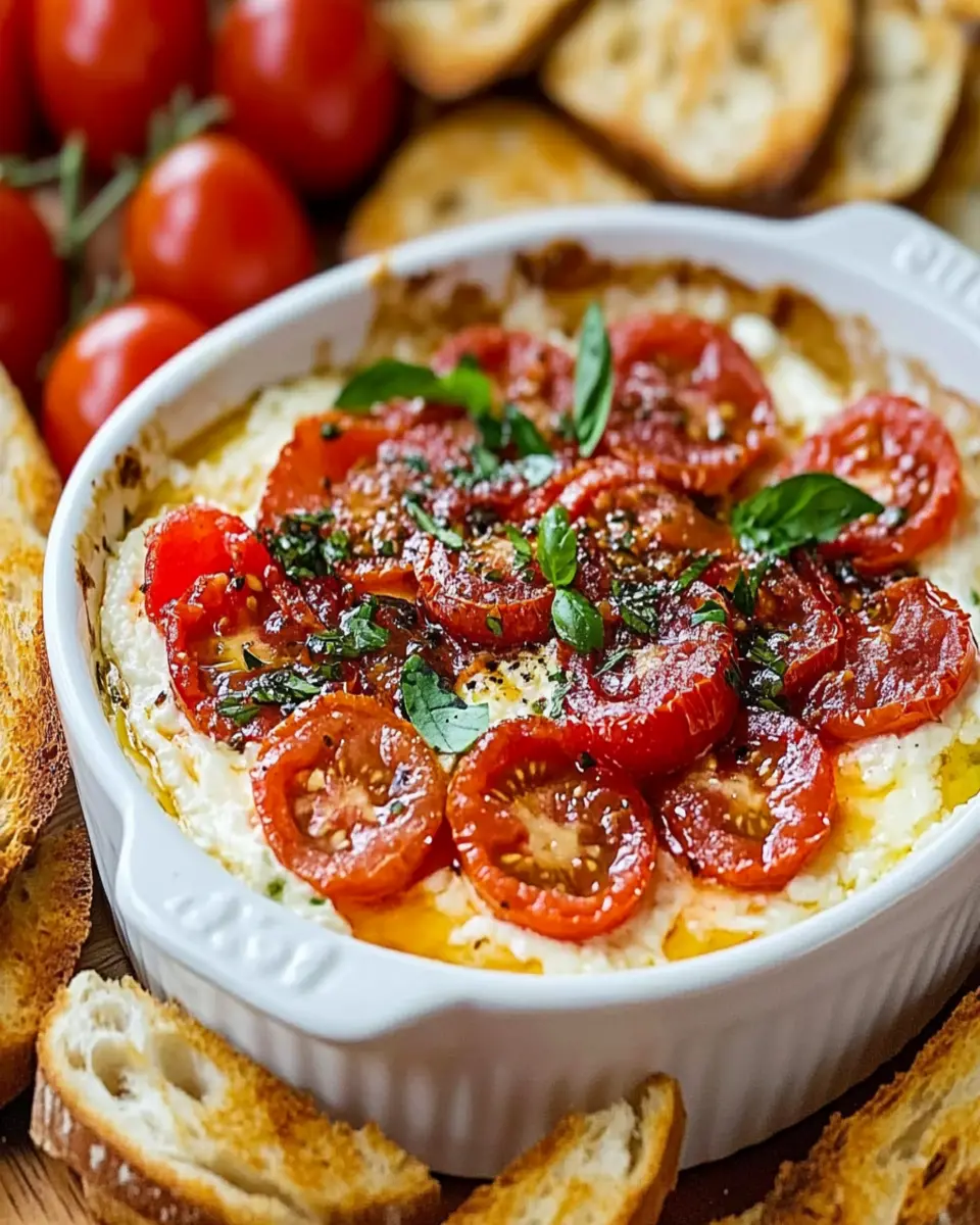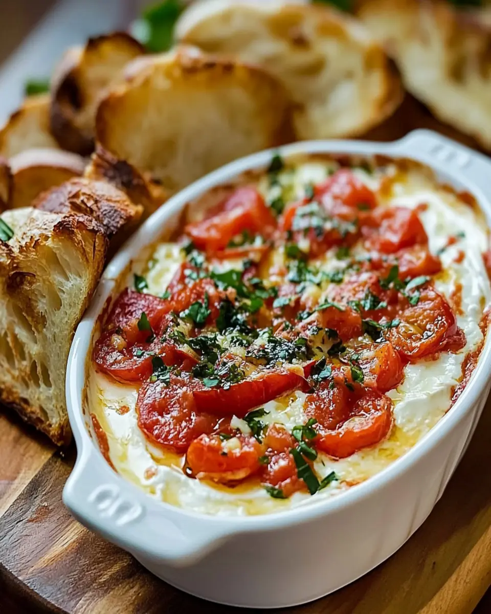 This is a delicious dip that combines the flavors of tomatoes, three types of cheese, and fresh herbs, perfect for parties!