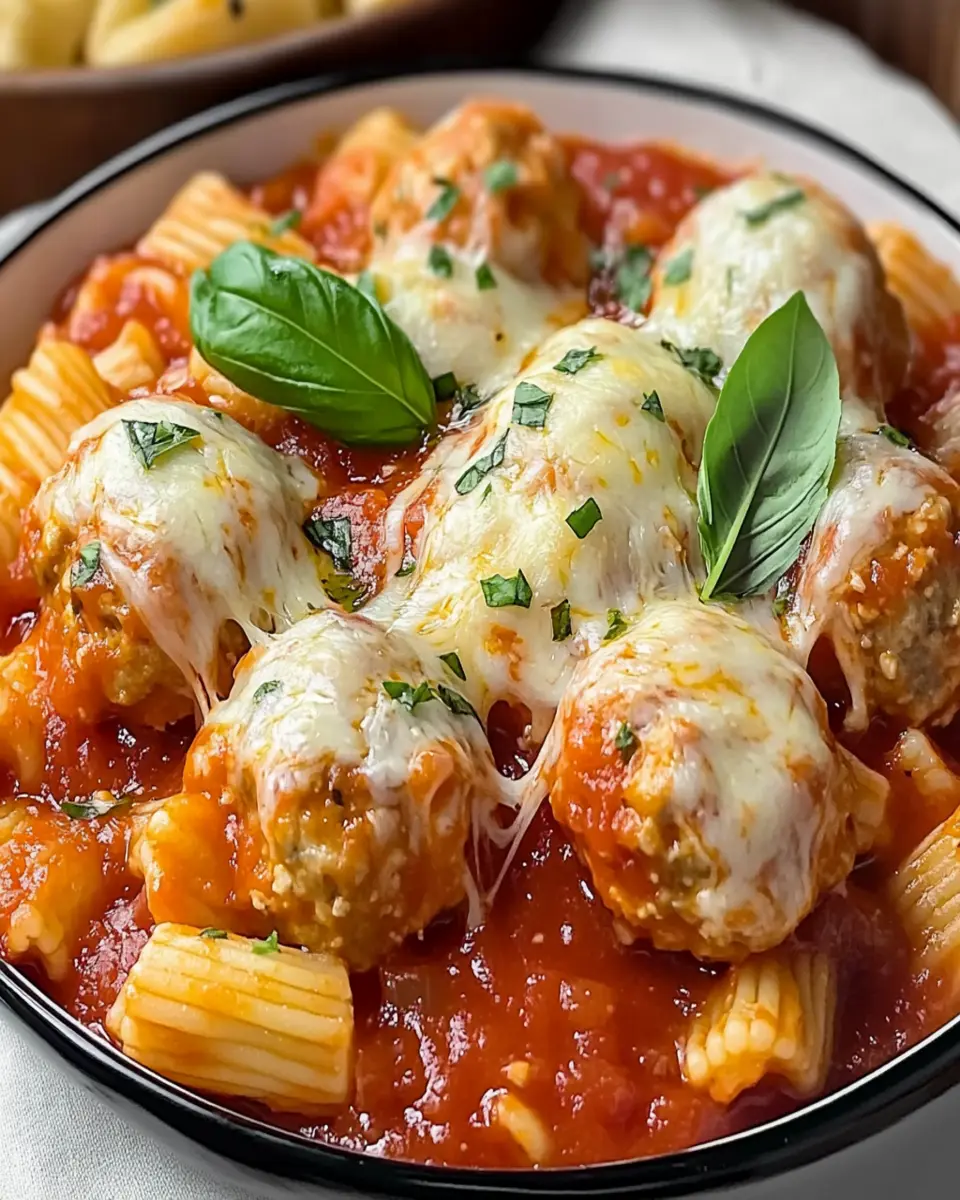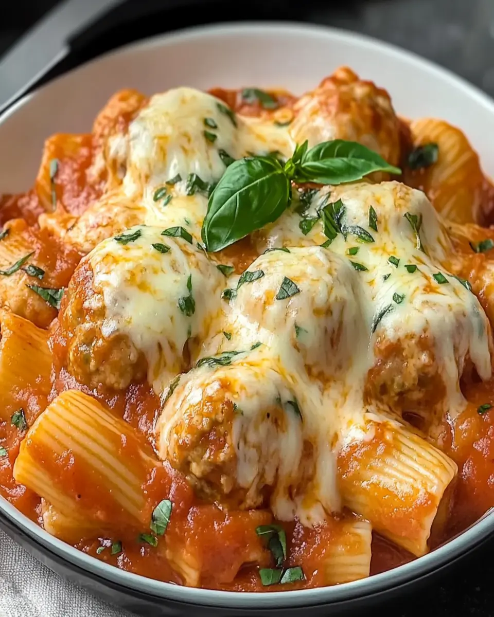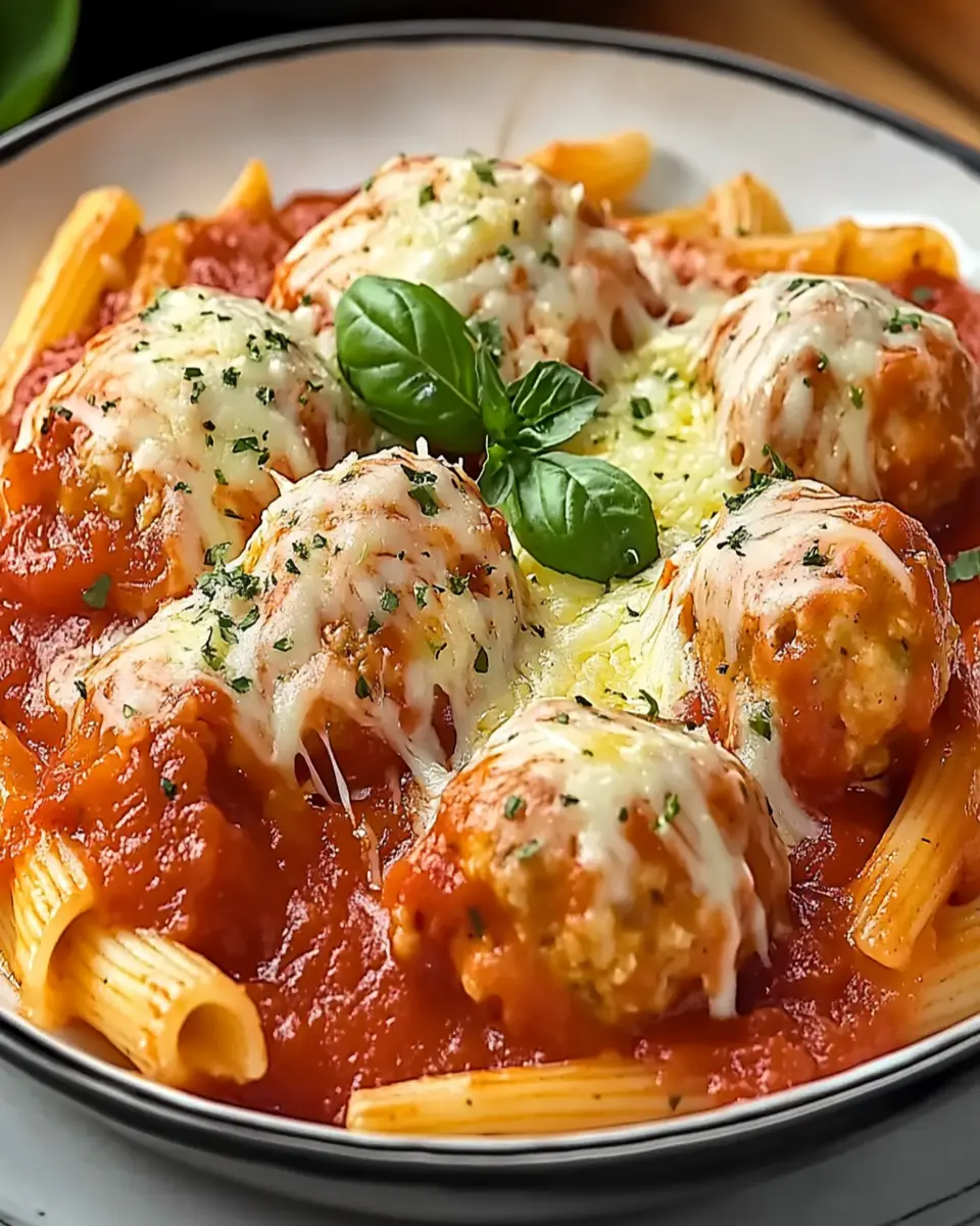 A delicious and comforting pasta dish featuring chicken meatballs in a rich tomato and cheese sauce.
